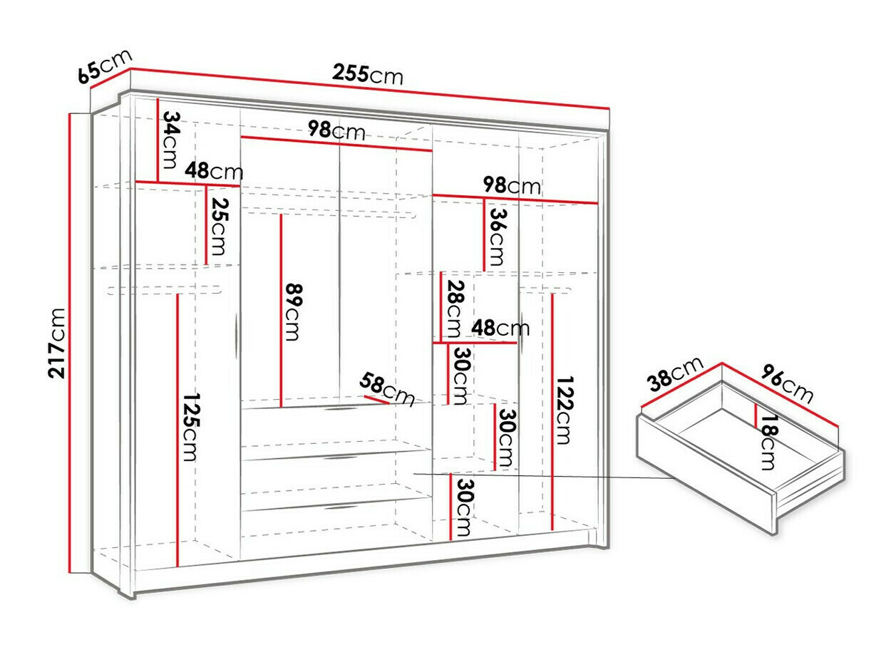Der Kleiderschrank ist ausgezeichnet, geräumig, nur die Schubladenschienen sind nicht von sehr guter Qualität, wodurch die Schubladen selbst ungleichmäßig schließen, Sie müssen darauf achten, die Ecken nicht zu klopfen und sie vorsichtig zu schieben.