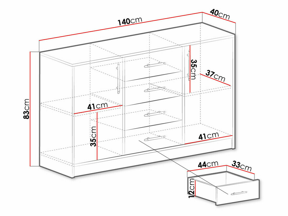 Le corps du meuble est en panneau stratifié de 16 mm d'épaisseur dont les bords sont recouverts d'un ruban adhésif spécial de la même couleur que le corps. Ce ruban est fait de plastique solide et sert de protection supplémentaire pour les panneaux. Les poignées en plastique de couleur métal sont faciles à utiliser et complètent l'image de cette collection fonctionnelle.