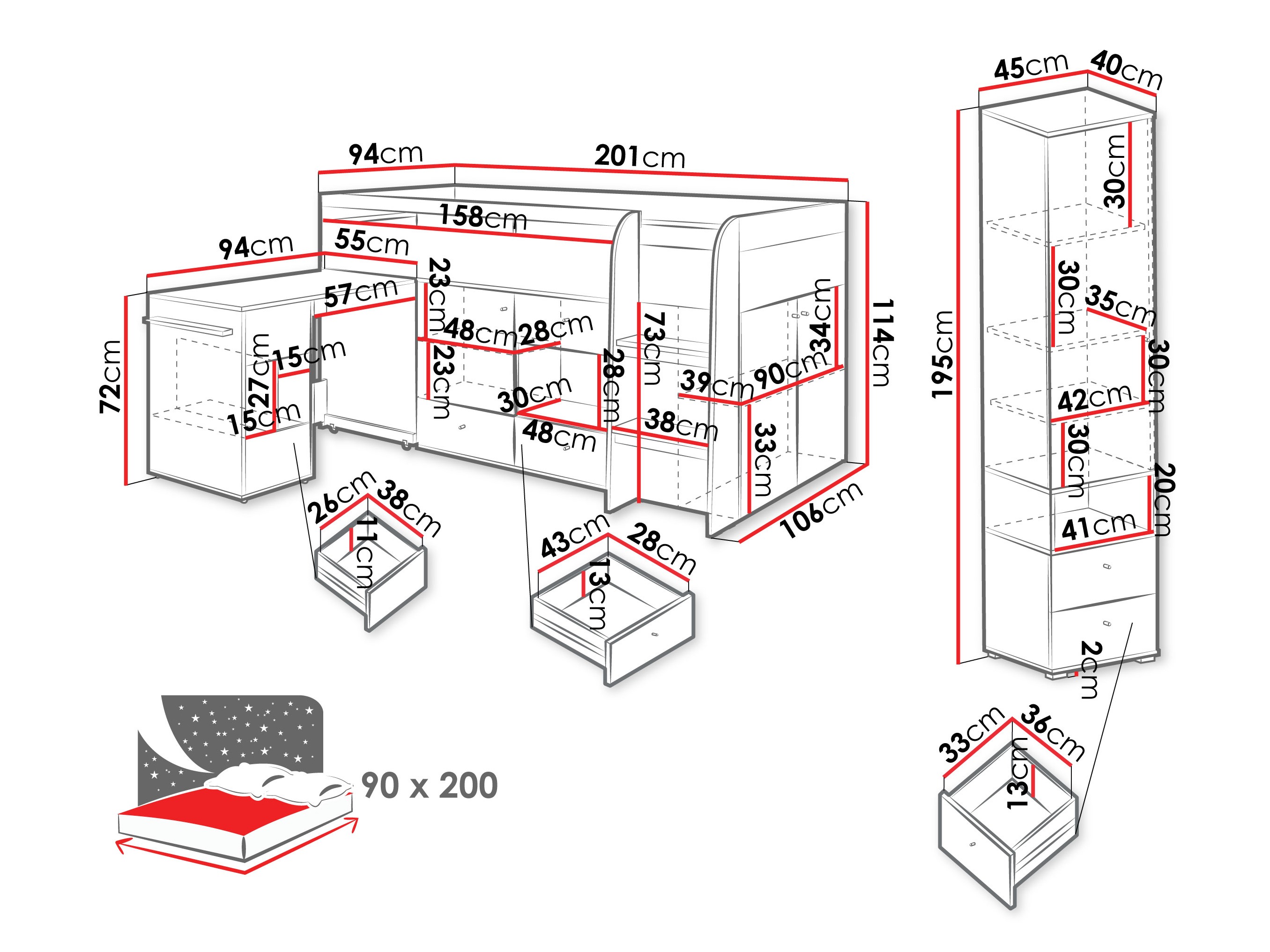 - 90 x 200 cm