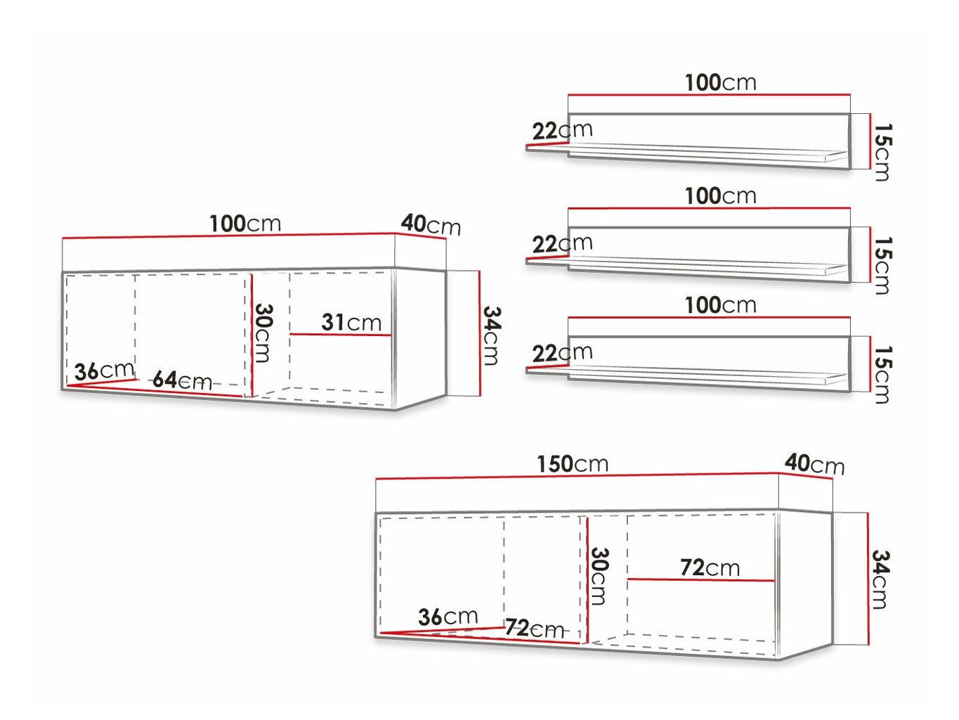 34 x 100 x 40; 34 x 150 x 40 cm