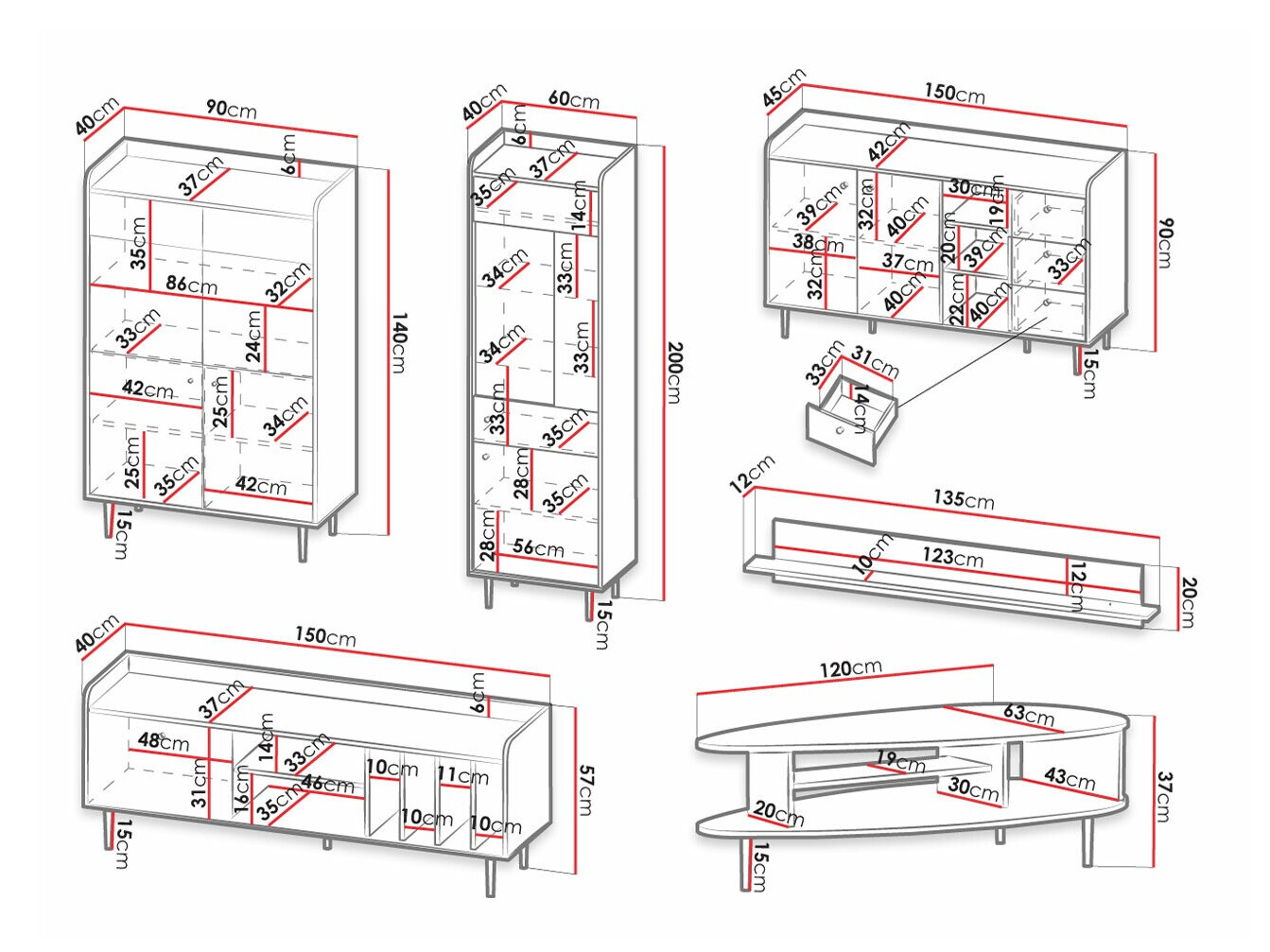 Subtilité, élégance, et une touche rétro - voilà comment on peut décrire brièvement cette collection. La forme élégante et la combinaison luxueuse du chêne foncé et de la couleur noire sont ce qui donne aux meubles leur caractère unique. La collection comprend tous les meubles nécessaires pour un salon organisé. Les meubles sont fabriqués en panneaux stratifiés, dont les bords sont protégés par un ruban ABS spécial. Grâce aux bords en ABS de haute qualité, les meubles sont plus résistants aux chocs. Les portes et les tiroirs sont dotés d'un mécanisme de fermeture silencieux, grâce auquel les tiroirs et les portes se ferment facilement sans faire de bruit. Les façades des meubles sont décorées de petites poignées métalliques noires, assorties aux meubles de cette élégante collection. Les gracieux pieds métalliques ajoutent de l'originalité et du style aux meubles de forme irrégulière. Les meubles de la collection possèdent des espaces de rangement ouverts et fermés, ils conviennent donc à l'exposition pratique des objets personnels. La partie vitrée des vitrines est en verre trempé. Sa résistance est 5 à 6 fois supérieure à celle du verre ordinaire, non traité thermiquement. Ce type de meuble est idéal pour exposer des décorations, de la vaisselle ou des photos. De plus, ce meuble peut être illuminé par un éclairage LED, qui peut être commandé en supplément. De plus, les vitrines sont universelles, il est donc possible de décider du sens d'ouverture des portes avec verre lors de leur montage. Créez un salon unique à partir de meubles individuels de la collection ou choisissez parmi les ensembles de meubles préfabriqués. Avec les meubles de cette collection, l'espace souhaité deviendra une oasis de confort et d'élégance.