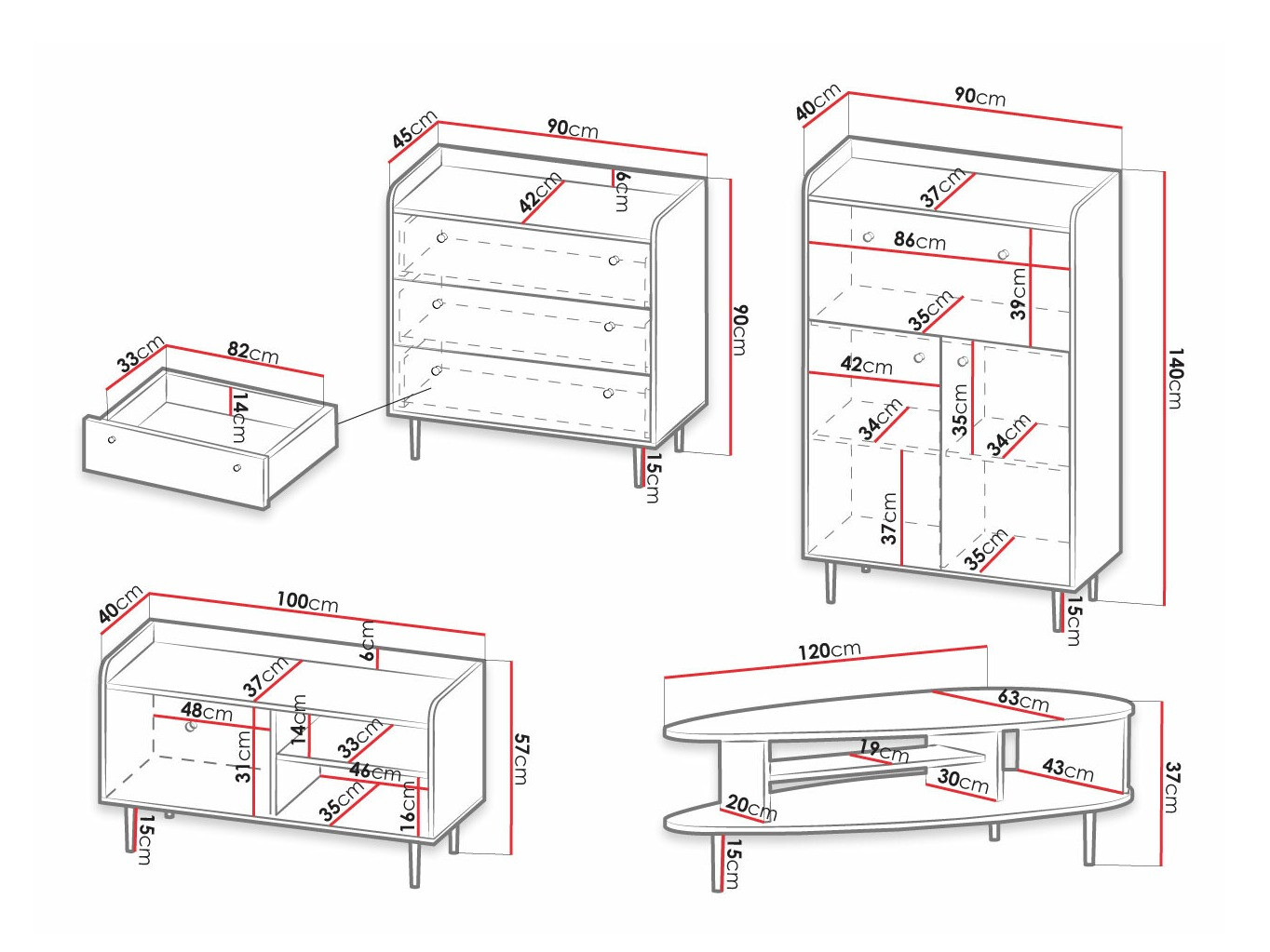 Subtilité, élégance, et une touche rétro - voilà comment on peut décrire brièvement cette collection. La forme élégante et la combinaison luxueuse du chêne foncé et de la couleur noire sont ce qui donne aux meubles leur caractère unique. La collection comprend tous les meubles nécessaires pour un salon organisé. Les meubles sont fabriqués en panneaux stratifiés, dont les bords sont protégés par un ruban ABS spécial. Grâce aux bords en ABS de haute qualité, les meubles sont plus résistants aux chocs. Les portes et les tiroirs sont dotés d'un mécanisme de fermeture silencieux, grâce auquel les tiroirs et les portes se ferment facilement sans faire de bruit. Les façades des meubles sont décorées de petites poignées métalliques noires, assorties aux meubles de cette élégante collection. Les gracieux pieds métalliques ajoutent de l'originalité et du style aux meubles de forme irrégulière. Les meubles de la collection possèdent des espaces de rangement ouverts et fermés, ils conviennent donc à l'exposition pratique des objets personnels. La partie vitrée des vitrines est en verre trempé. Sa résistance est 5 à 6 fois supérieure à celle du verre ordinaire, non traité thermiquement. Ce type de meuble est idéal pour exposer des décorations, de la vaisselle ou des photos. De plus, ce meuble peut être illuminé par un éclairage LED, qui peut être commandé en supplément. De plus, les vitrines sont universelles, il est donc possible de décider du sens d'ouverture des portes avec verre lors de leur montage. Créez un salon unique à partir de meubles individuels de la collection ou choisissez parmi les ensembles de meubles préfabriqués. Avec les meubles de cette collection, l'espace souhaité deviendra une oasis de confort et d'élégance.