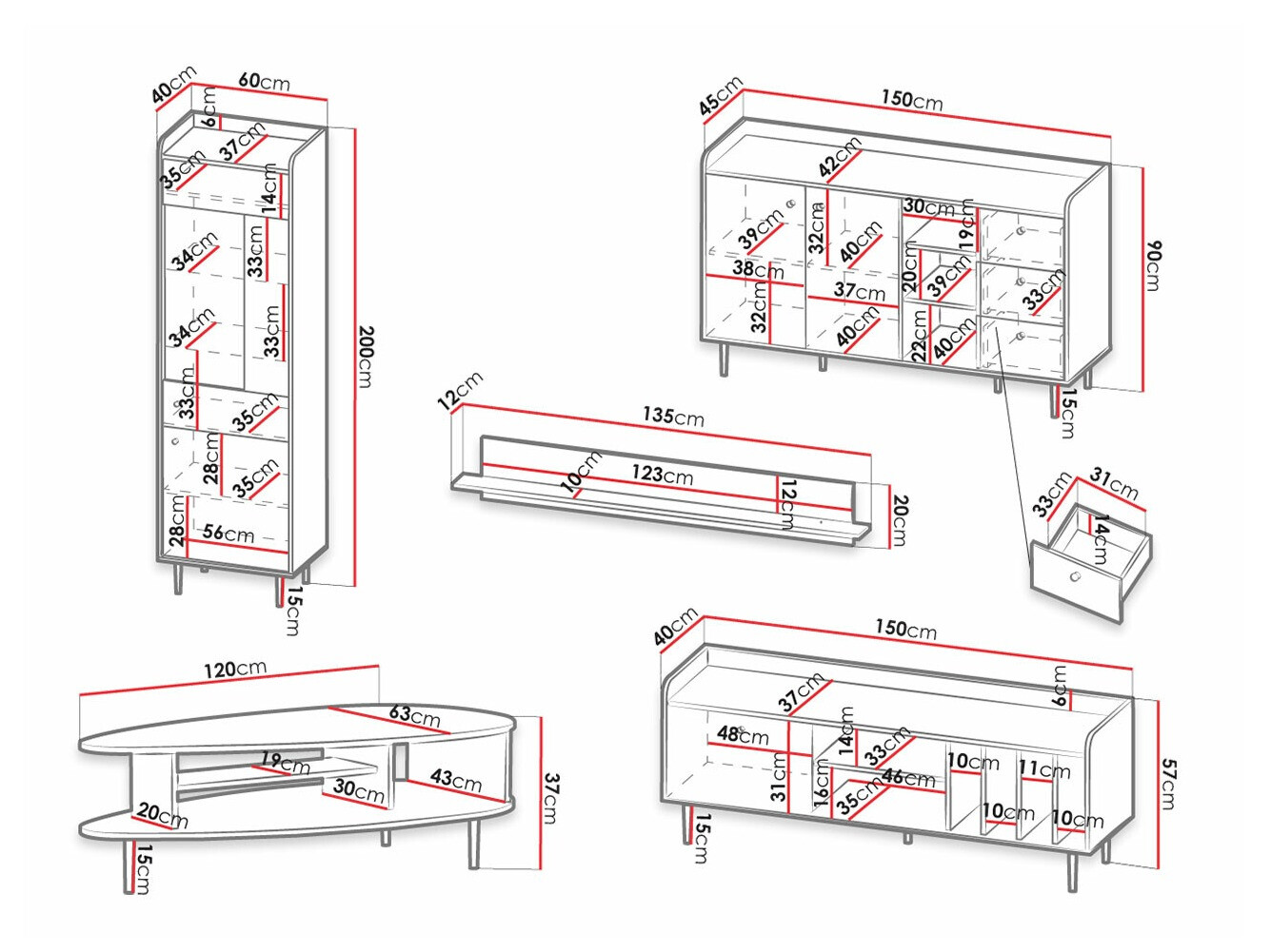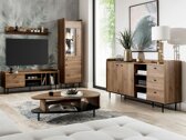 Subtilité, élégance, et une touche rétro - voilà comment on peut décrire brièvement cette collection. La forme élégante et la combinaison luxueuse du chêne foncé et de la couleur noire sont ce qui donne aux meubles leur caractère unique. La collection comprend tous les meubles nécessaires pour un salon organisé. Les meubles sont fabriqués en panneaux stratifiés, dont les bords sont protégés par un ruban ABS spécial. Grâce aux bords en ABS de haute qualité, les meubles sont plus résistants aux chocs. Les portes et les tiroirs sont dotés d'un mécanisme de fermeture silencieux, grâce auquel les tiroirs et les portes se ferment facilement sans faire de bruit. Les façades des meubles sont décorées de petites poignées métalliques noires, assorties aux meubles de cette élégante collection. Les gracieux pieds métalliques ajoutent de l'originalité et du style aux meubles de forme irrégulière. Les meubles de la collection possèdent des espaces de rangement ouverts et fermés, ils conviennent donc à l'exposition pratique des objets personnels. La partie vitrée des vitrines est en verre trempé. Sa résistance est 5 à 6 fois supérieure à celle du verre ordinaire, non traité thermiquement. Ce type de meuble est idéal pour exposer des décorations, de la vaisselle ou des photos. De plus, ce meuble peut être illuminé par un éclairage LED, qui peut être commandé en supplément. De plus, les vitrines sont universelles, il est donc possible de décider du sens d'ouverture des portes avec verre lors de leur montage. Créez un salon unique à partir de meubles individuels de la collection ou choisissez parmi les ensembles de meubles préfabriqués. Avec les meubles de cette collection, l'espace souhaité deviendra une oasis de confort et d'élégance.