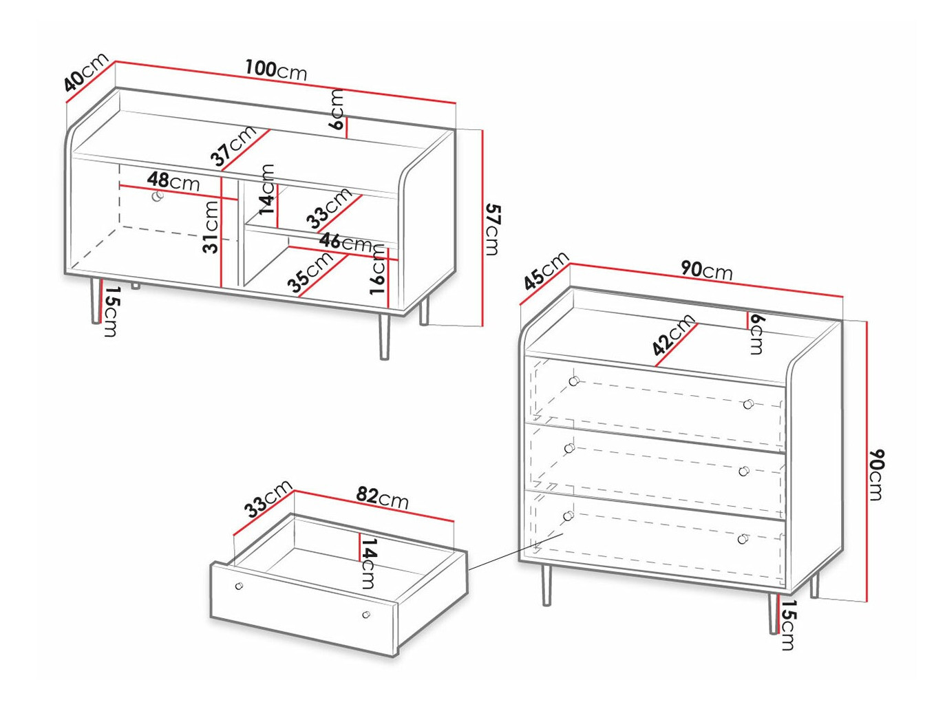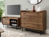 Subtilité, élégance, et une touche rétro - voilà comment on peut décrire brièvement cette collection. La forme élégante et la combinaison luxueuse du chêne foncé et de la couleur noire sont ce qui donne aux meubles leur caractère unique. La collection comprend tous les meubles nécessaires pour un salon organisé. Les meubles sont fabriqués en panneaux stratifiés, dont les bords sont protégés par un ruban ABS spécial. Grâce aux bords en ABS de haute qualité, les meubles sont plus résistants aux chocs. Les portes et les tiroirs sont dotés d'un mécanisme de fermeture silencieux, grâce auquel les tiroirs et les portes se ferment facilement sans faire de bruit. Les façades des meubles sont décorées de petites poignées métalliques noires, assorties aux meubles de cette élégante collection. Les gracieux pieds métalliques ajoutent de l'originalité et du style aux meubles de forme irrégulière. Les meubles de la collection possèdent des espaces de rangement ouverts et fermés, ils conviennent donc à l'exposition pratique des objets personnels. La partie vitrée des vitrines est en verre trempé. Sa résistance est 5 à 6 fois supérieure à celle du verre ordinaire, non traité thermiquement. Ce type de meuble est idéal pour exposer des décorations, de la vaisselle ou des photos. De plus, ce meuble peut être illuminé par un éclairage LED, qui peut être commandé en supplément. De plus, les vitrines sont universelles, il est donc possible de décider du sens d'ouverture des portes avec verre lors de leur montage. Créez un salon unique à partir de meubles individuels de la collection ou choisissez parmi les ensembles de meubles préfabriqués. Avec les meubles de cette collection, l'espace souhaité deviendra une oasis de confort et d'élégance.