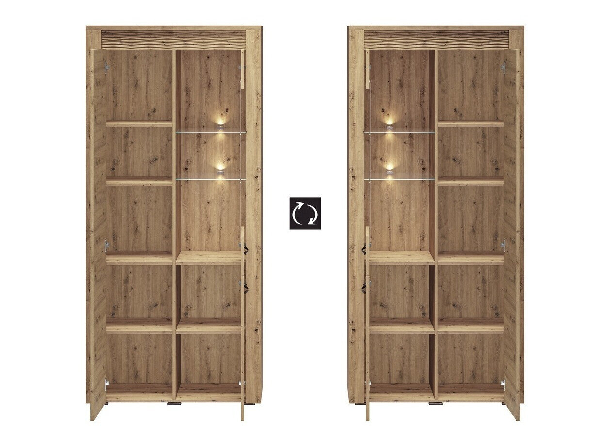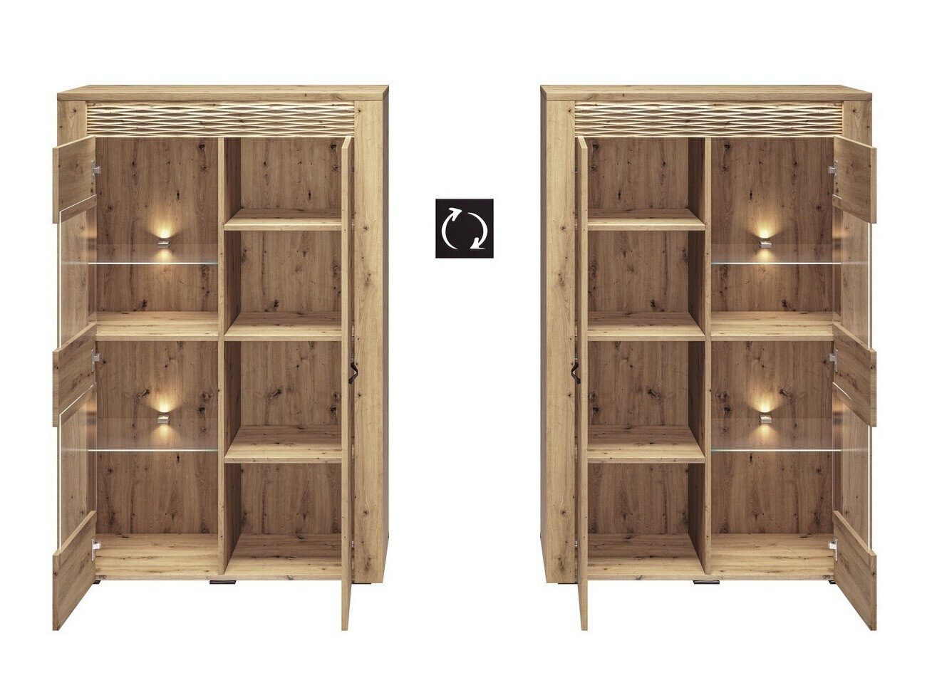 Les façades des meubles sont imprimées du motif en bois que qui rend la collection unique. Les poignées métalliques soulignent encore plus le design exclusif du mobilier. Un caractère supplémentaire est donné par les ornements décoratifs, qui sont accentués par l'éclairage LEDintégré dans les façades des meubles. Vous pouvez également commander un éclairage LED pour vitrines, qui mettra en valeur les détails de l'intérieur. Les façades en «Artisan» chêne, verre trempé, l'éclairage LED et les poignées métalliques rendent la collection unique. Tout est façonné par l'espace parfaitement utilisé dans le mobilier. Par conséquent, vous pourrez placer tous vos objets les plus importants.