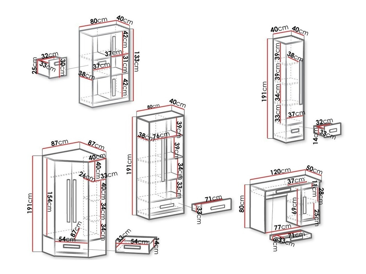 191 x 40 x 40; 191 x 80 x 40 cm