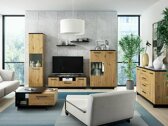 Cette collection de mobilier propose des meubles pour le salon et la chambre à coucher. Le design moderne et les lignes élégantes se complètent pour créer une combinaison parfaite. La collection attire le regard par ses couleurs chaudes et ses motifs bois. Les panneaux noirs mats sont assortis aux façades en chêne. Cette combinaison de couleurs se complète, soulignant la forme du meuble. Le verre trempé est utilisé dans les vitrines, qui est plus résistant que le verre ordinaire. Un lit au design exclusif deviendra le point culminant de la chambre. Tête de lit moelleuse, boîte à linge de lit, mécanisme de levage à gaz, tout ce dont vous avez besoin pour un repos parfait. Les bords des meubles de cette collection sont protégés par du ruban de finition, qui est généralement utilisé pour protéger les bords des panneaux.