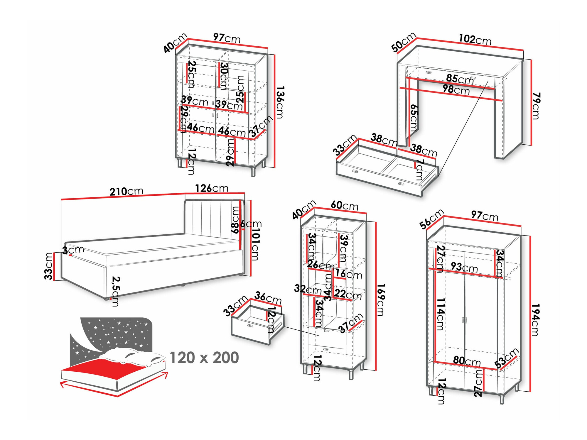 136 x 97 x 40; 169 x 60 x 40 cm
