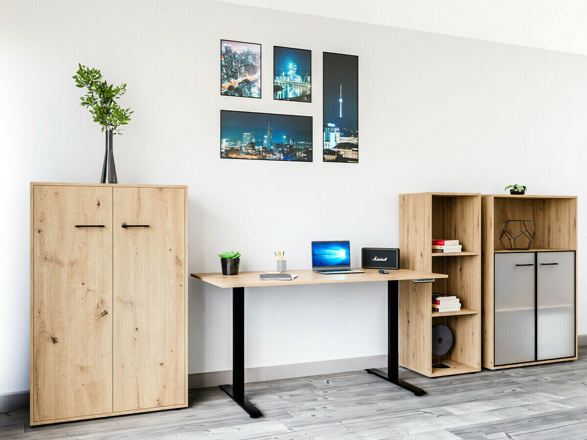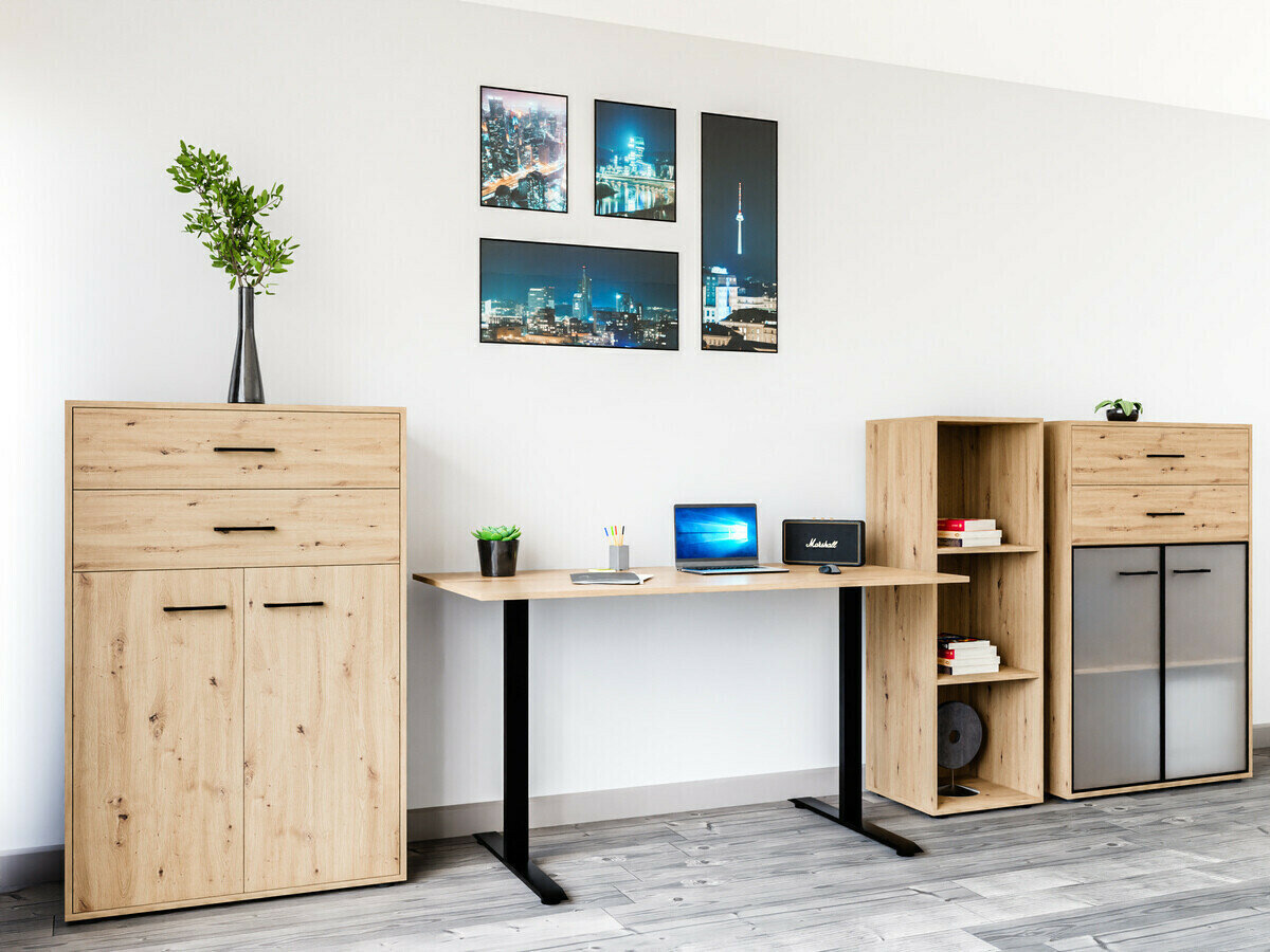 Si vous recherchez des meubles pour un bureau fonctionnel, cette collection est faite pour vous. La combinaison de couleurs chêne « Artisan » et noir ajoute de la modernité au mobilier. Les poignées minimalistes en plastique noir s'intègrent parfaitement au design. Les meubles de la collection sont fabriqués en panneaux de particules stratifiés avec une surface résistante aux rayures. Grâce à ce film protecteur, les meubles deviennent non seulement résistants aux rayures, mais aussi mieux protégés de l'humidité ou des taches. Le mécanisme de fermeture silencieuse intégré aux meubles améliorera encore l'expérience de l'utilisateur et assurera l'ouverture et la fermeture silencieuses des portes et des tiroirs. Le meuble dispose de zones de rangement ouvertes et fermées. Les objets personnels peuvent ainsi être rangés sur des étagères visibles ou cachés derrière des portes. La collection utilise du verre dépoli trempé et traité thermiquement. Sa résistance est 5 à 6 fois supérieure à celle du verre ordinaire, non traité thermiquement. Le verre est façonné par un cadre en aluminium noir. Les étagères de la collection sont universelles. Lors de leur montage, il est possible de décider dans quel sens la porte s'ouvrira. Les blocs-tiroirs utilisent des roulettes au lieu de pieds, ce qui rendra extrêmement facile et pratique le déplacement des meubles dans la pièce. De plus, les étagères à verrouillage permettront de ranger les objets personnels en toute sécurité. La base des bureaux de la collection est constituée d'un cadre métallique noir qui assure la stabilité. Pour ceux qui recherchent un bureau fonctionnel, la collection propose des bureaux dotés d'un mécanisme électrique de réglage de la hauteur. Il suffit d'appuyer sur quelques boutons pour que la hauteur de la table change et que vous puissiez travailler de manière encore plus confortable et ergonomique. >Avec des meubles fonctionnels et universels, l'aménagement d'un espace de bureau sera un plaisir.