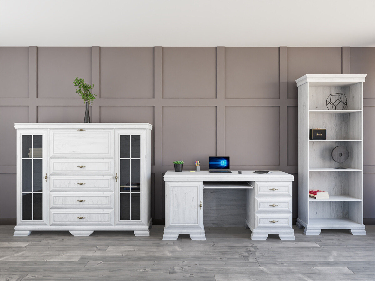 Cette collection de style classique est destinée à ceux qui apprécient le design et l'élégance intemporels. Les meubles de la collection sont ornés de poignées en métal au design exclusif, ce qui donne à chaque pièce un accent luxueux. L'une des caractéristiques les plus importantes de cette collection est sa surface résistante aux rayures, qui garantit la durabilité des meubles. Même après de nombreuses années d'utilisation continue, ces meubles conserveront leur aspect impeccable. Cette collection ne se contente pas d'être élégante, elle accorde également une grande importance à la fonctionnalité. Les étagères et les tiroirs sont spacieux, ce qui vous permet de disposer de suffisamment d'espace pour organiser vos objets. La combinaison du style classique et de l'aspect pratique garantit que cette collection ne décorera pas seulement votre intérieur mais améliorera également la qualité de votre vie quotidienne. Appréciez la beauté du style classique et faites entrer l'élégance intemporelle dans votre maison.