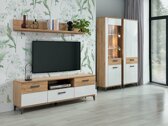 Vous serez probablement d'accord pour dire que passer du temps dans un salon confortable est un véritable plaisir - il suffit d'avoir le bon mobilier qui aiderait à créer l'ambiance désirée. Cette collection de meubles de salon est parfaite pour ceux qui recherchent des solutions modernes, mais aussi confortables, pour leur espace domestique. Les meubles combinent le blanc brillant et le chêne doré. Cette combinaison de couleurs rayonne de chaleur et d'intimité. De plus, l'impression de naturel est donnée aux meubles par les motifs en bois, dont on peut voir des traces sur les façades des meubles. Les poignées des meubles constituent un accent important, car elles confèrent aux meubles un caractère unique grâce à leur design. La forme des poignées et l'emplacement des incrustations en chêne doré créent une combinaison ludique. La fonctionnalité n'est pas oubliée non plus : des sections de meubles, des étagères et des vitrines spacieuses vous permettront de ranger facilement tous les objets les plus importants. Les vitrines sont fabriquées en verre trempé, dont la résistance mécanique est supérieure à celle du verre ordinaire non traité thermiquement. Les tiroirs et les portes sont dotés d'un mécanisme de fermeture silencieux. Ce mécanisme a la particularité d'empêcher les portes et les tiroirs de se fermer rapidement. Vous créerez une atmosphère encore plus chaleureuse chez vous si vous commandez un éclairage LED supplémentaire.