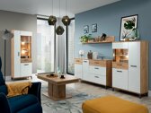 Vous serez probablement d'accord pour dire que passer du temps dans un salon confortable est un véritable plaisir - il suffit d'avoir le bon mobilier qui aiderait à créer l'ambiance désirée. Cette collection de meubles de salon est parfaite pour ceux qui recherchent des solutions modernes, mais aussi confortables, pour leur espace domestique. Les meubles combinent le blanc brillant et le chêne doré. Cette combinaison de couleurs rayonne de chaleur et d'intimité. De plus, l'impression de naturel est donnée aux meubles par les motifs en bois, dont on peut voir des traces sur les façades des meubles. Les poignées des meubles constituent un accent important, car elles confèrent aux meubles un caractère unique grâce à leur design. La forme des poignées et l'emplacement des incrustations en chêne doré créent une combinaison ludique. La fonctionnalité n'est pas oubliée non plus : des sections de meubles, des étagères et des vitrines spacieuses vous permettront de ranger facilement tous les objets les plus importants. Les vitrines sont fabriquées en verre trempé, dont la résistance mécanique est supérieure à celle du verre ordinaire non traité thermiquement. Les tiroirs et les portes sont dotés d'un mécanisme de fermeture silencieux. Ce mécanisme a la particularité d'empêcher les portes et les tiroirs de se fermer rapidement. Vous créerez une atmosphère encore plus chaleureuse chez vous si vous commandez un éclairage LED supplémentaire.