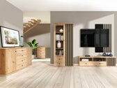 La couleur chêne « Artisan » domine dans la collection et des notes de motifs bois sont visibles sur les façades. Les petites poignées en métal noir se fondent parfaitement dans l'ensemble du design. Les lignes verticales décoratives deviennent un accent de la collection. Cette solution confère au meuble un caractère exclusif et remplace également les poignées du meuble en permettant l'ouverture des portes du meuble. Les meubles ne manquent pas d'étagères et de tiroirs, ce qui aidera à ranger les choses les plus importantes. Un mécanisme de fermeture silencieux est installé dans le meuble, ce qui est spécial car il protège les portes et les tiroirs d'une fermeture rapide. Grâce à des amortisseurs spéciaux, les portes et les tiroirs sont arrêtés juste avant la fermeture et se rétractent lentement sans faire de bruit. D'une commode à une vitrine, d'un meuble TV à une étagère suspendue, dans cette collection, vous trouverez une variété de meubles pour le salon. Si vous souhaitez créer un intérieur complet sans trop d'efforts, choisissez un ensemble de meubles.