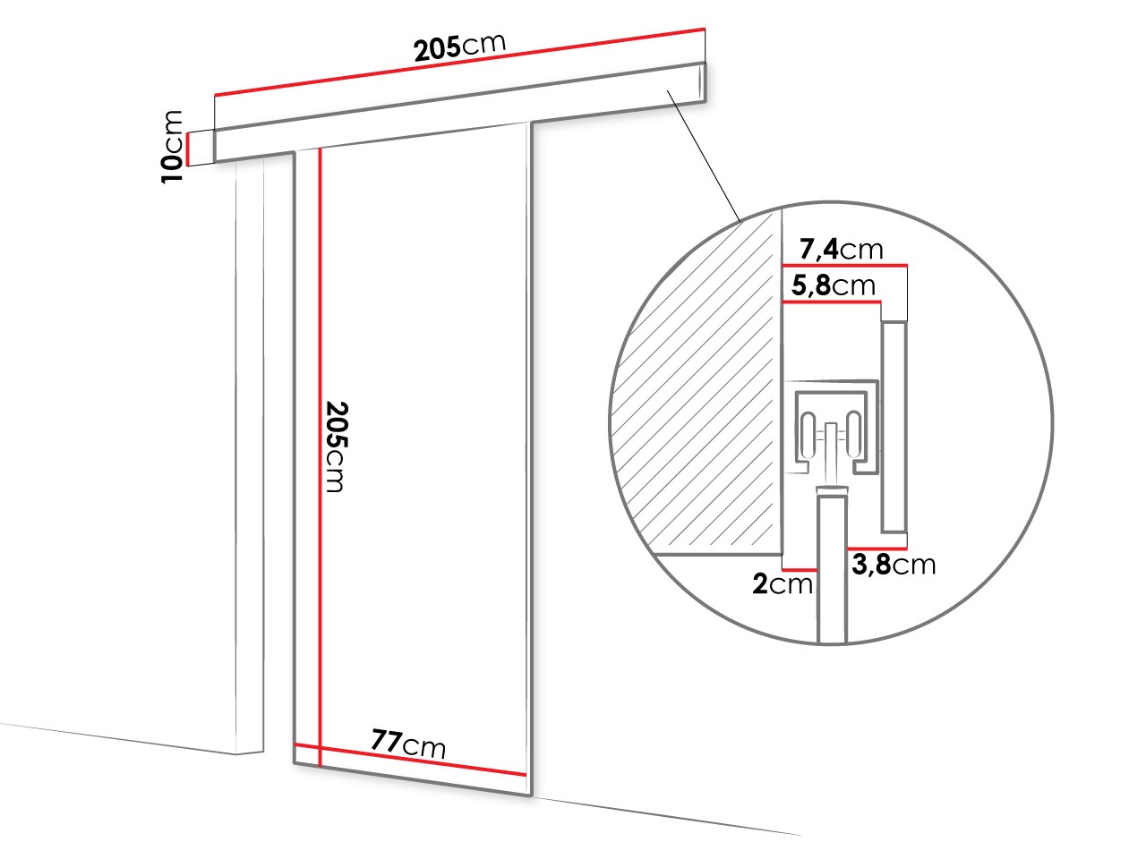 Il est important de bien fixer la porte coulissante. Ce type de porte n'est pas livré avec des vis de fixation, vous devrez donc vous en occuper vous-même. Chaque mur nécessite un type de vis différent ou même une profondeur de perçage différente. Choisissez les vis de fixation en fonction du poids de la porte et du type de murs : maçonnerie, bois, etc.