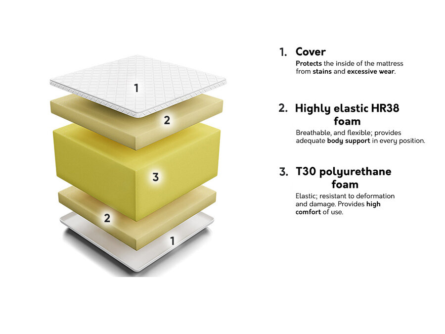 Les matelas en mousse de polyuréthane utilisent un rembourrage en mousse froide HR, qui a une plus grande élasticité et assure un confort de sommeil. Grâce à ses propriétés élastiques exceptionnelles, le matelas s'adapte aux lignes du corps pendant le sommeil. La mousse de polyuréthane HR a également des propriétés anti-allergiques.