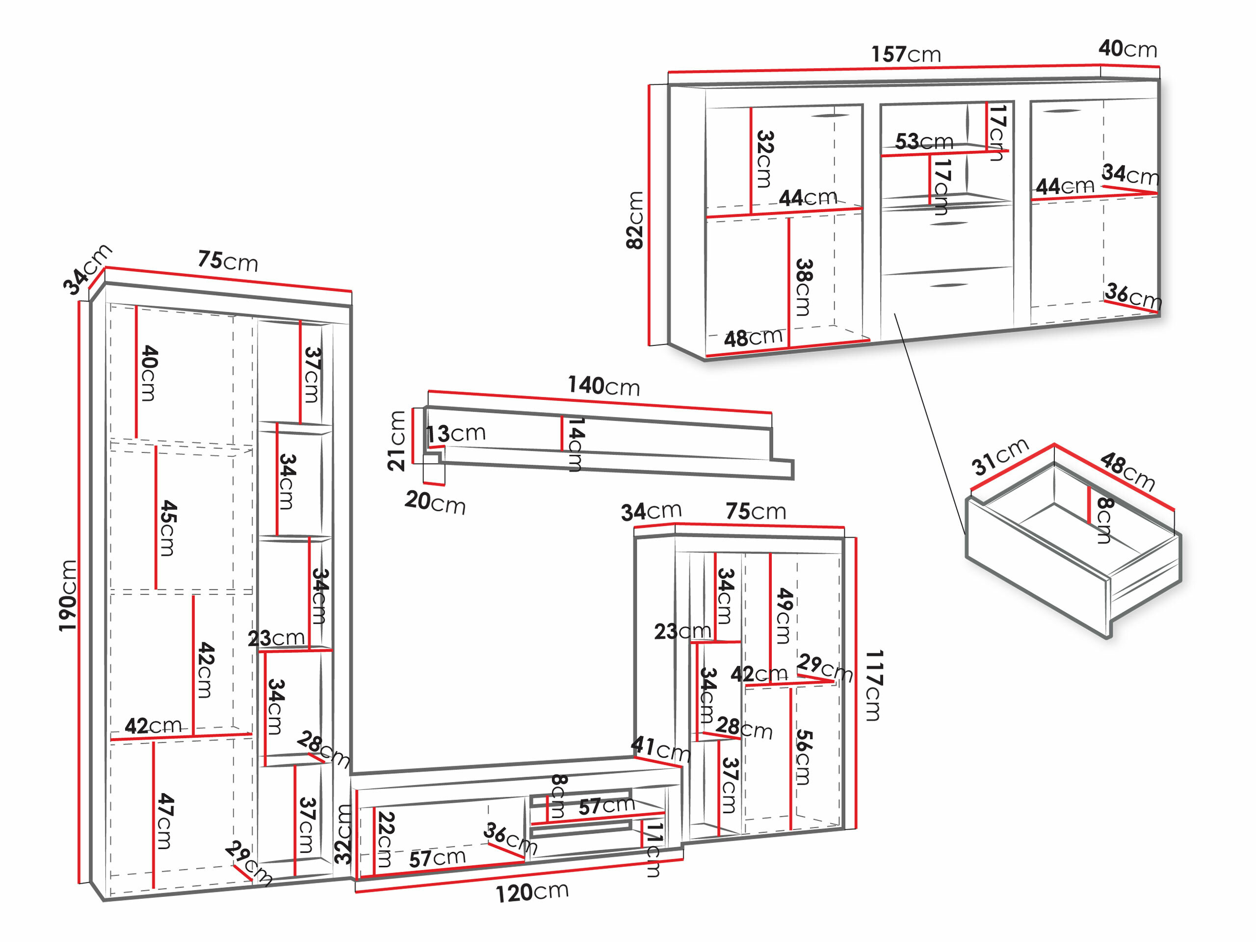 Super, sehr schönes Set. Schade nur, dass es dort, wo die Glasböden sind, keine Türen gibt.
